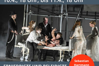 11. April 2020. Weil die Theater nicht mehr spielen können, stellt nachtkritik.de einen digitalen Spielplan aus Mitschnitten von Inszenierungen zusammen: Vom 11. April 18 Uhr bis 12. April 18 Uhr zeigen wir "Erniedrigte und Beleidigte" in der Regie von Sebastian Hartmann nach dem Roman von Fjodor Dostojewski, mit Texten aus der Poetikvorlesung, die der Dramatiker Wolfram Lotz 2017 auf nachtkritik.de veröffentlichte. Premiere der Inszenierung war am 29. März 2018 am Staatsschauspiel Dresden. Der Abend wurde zum Berliner Theatertreffens 2019 eingeladen. In seiner Nachtkritik zur Premiere feierte Matthias Schmidt die Inszenierung als Gesamtkunstwerk: "Jetzt könnt ihr selbst erleben, wie es sein kann, das Theater, wenn es die Konventionen sprengt, frei und wild, respektlos und verrückt und, ja, auch anstrengend."
