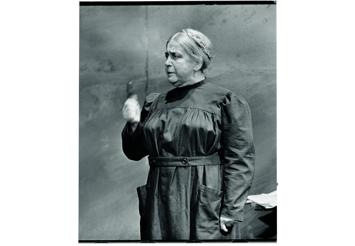 Die Schauspielerin Steffie Spira im knöchellangen weißen Gewand, auf einer Holzpalette stehend. Mit großer Prophetinnen-Geste stellt sie die historische Szene nach, als sie bei der Massendemonstration auf dem Berliner Alexanderplatz am 4. November 1989 die DDR-Führung zum Rücktritt aufforderte.