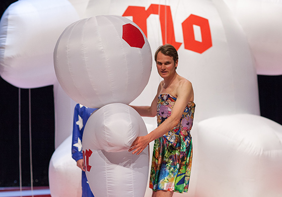 Was gibt's noch zu berichten? Ach ja, Bert Neumanns Bühne ist mal wieder von Lamettavorhängen umsäumt, der Boden ist rot-weiß gestreift, und mit fünf intermittierenden Tänzern in blau-weißen Sternkostümen ergänzt sich dieses Arrangement zur Amerika-Flagge. Dann wird noch ein gigantischer weißer Gummi-Teddybär mit "No fear"-Aufschrift aufgeblasen, den Hinrichs unter Aufbietung all seiner Kräfte aus der horizontalen in die aufrechte Position bringt ("Das war sehr anstrengend!"). Aber das sind alles Stränge, die man nicht unbedingt braucht, selbst wenn sie irgendwie schön sind. Den Strang Pollesch/Hinrichs aber, diesen so ganz eigenen Zusammenklang, den braucht man schon. Und das Volksbühnen-Publikum applaudiert hingerissen.