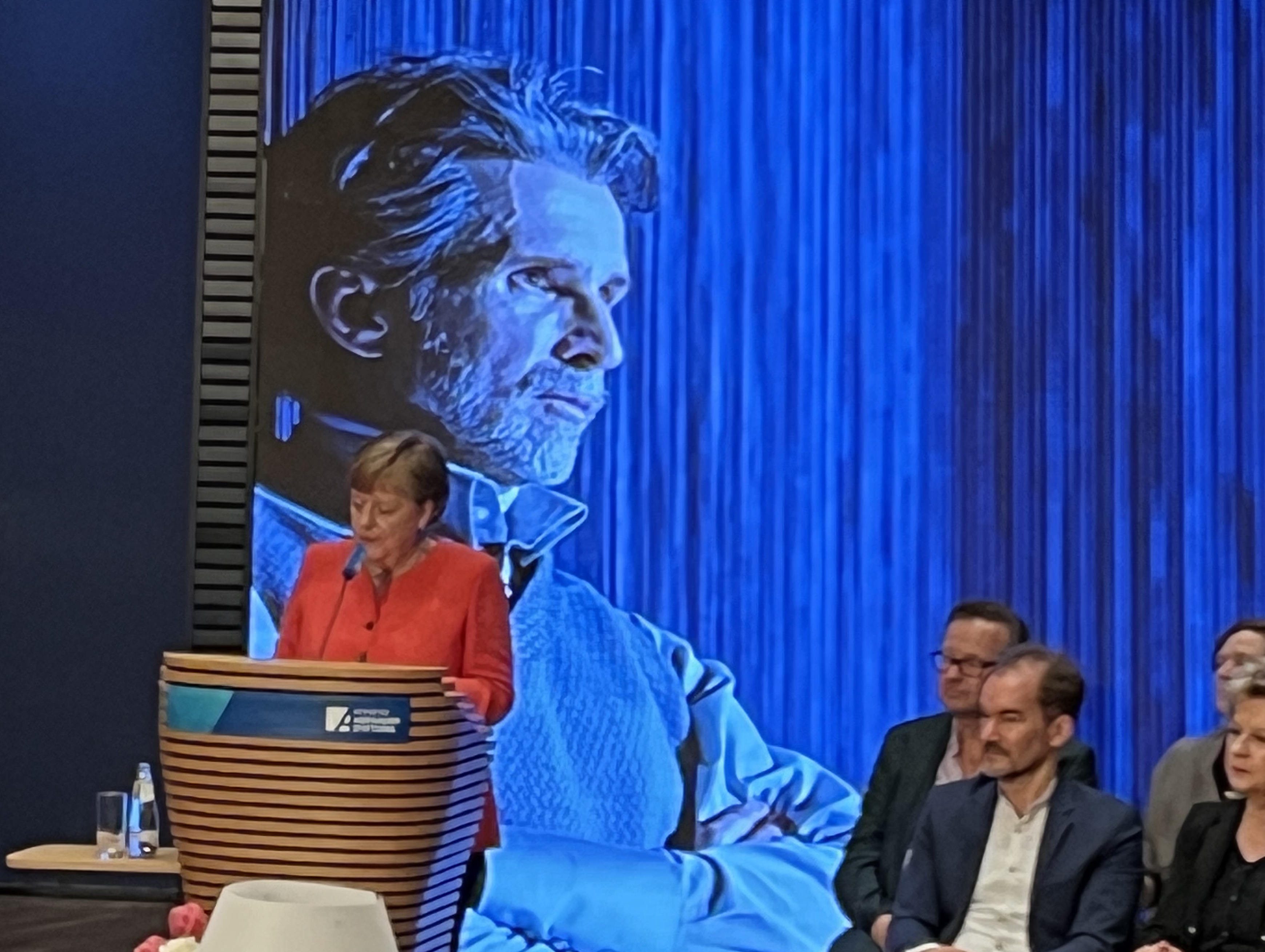 Merkel kam mit trockenem Humor statt mit Allgemeinplätzen über die Bedeutung des Theaters für die Demokratie. Es sei natürlich ein Risiko, so die Bundeskanzlerin a. D., dass sie hier nun als passionierte Laiin die Arbeit eines Schauspielers wie Ulrich Matthes würdige. Andererseits sei sie in ihrem früheren Berufsleben in der Politik immer wieder auf Theaterbegriffe gestoßen und habe sie auch selbst des Öfteren benutzt. Mit einiger Süffisanz gab Merkel dann eine Episode zum Besten, wie das Theaterspiel etwa im Kontext um das Drama eines gescheiterten Gesetzesentwurfs 2002 zum Einsatz kam, als die Kollegen Politiker das Repertoire der Vortäuschung von Gefühlen in Gänze ausgeschöpft hätten.