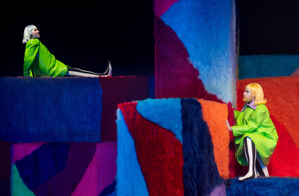 Regisseurin Schmidt setzt das knallig und kunterbunt in Szene – vor beplüschten Quadern und mit zwei Schauspielern, die man in Angry Birds nicht als Gegner würde haben wollen. In der Auftaktszene beschreiben sich Dreckspfau und Spatz in jeweils drei Worten. Auf Patrick Schnicke und Sandro Šutalo angewendet: Šutalo ist bad ass, bitchy und bäm. Schnicke ist sardonisch, sarkastisch und sassy. Ein Duo, das die beiden Ebenen des Abends traumwandlerisch verbindet, zusammen mit einer Musikauswahl, die Klassiker von Abbas "Dancing Queen" bis Strauss' "Also sprach Zarathustra" kongenial zur Gestaltung der Szenen einsetzt.