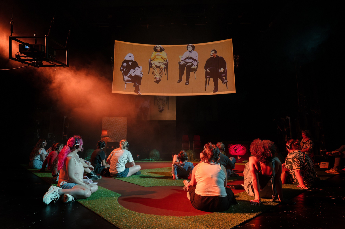 12. Juli 2024. Hier und da ein paar alte Sessel, Stehlampen mit Stoffschirm, eine Projektionsfläche: Wohnzimmeratmosphäre. Auf dem Boden ein Teppich, der an ein Baseball-Feld erinnert. Die Einladung wird direkt mehrfach ausgesprochen: Sucht euch einen Platz, lasst euch nieder, bewegt euch wann und wie ihr wollt – und hört zu. Kopfhörer bekommt hier nämlich jede Person in die Hand gedrückt, die die Treppen hoch in den Bühnenraum geht. Der multimediale Raum von Simone Dede Ayivi und ihren Kompliz*innen ist nach der Premiere in Berlin nach Mannheim gereist und wurde hier noch erweitert.