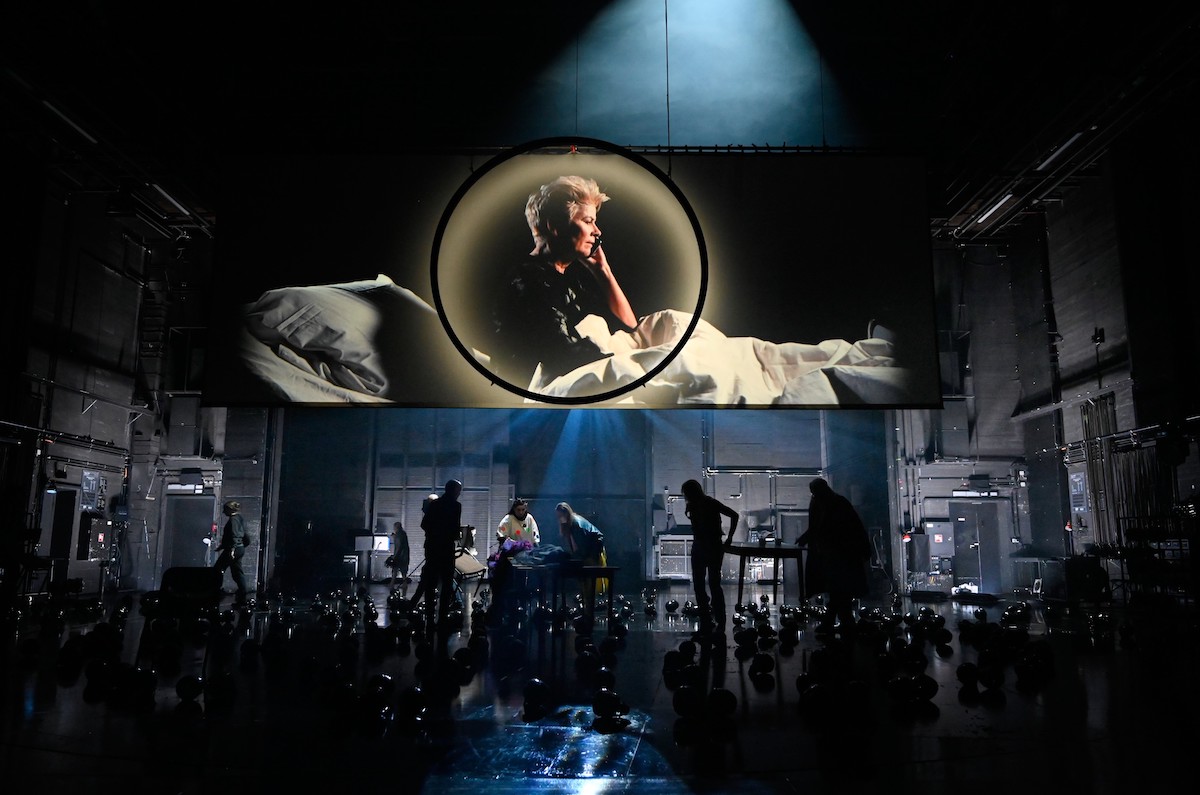 Richters Lear hinterließ seinen Töchtern ein kaputtes Land. Das drehbare Bühnenbild von Wolfgang Menardi zeigt eine freudlos-finstere Machtzentrale eines autoritären Staates. Alles schwarz: die Fahnen, die den Raum umrahmen, das Lear-Standbild, der Boden ist dick bedeckt mit Asche. Wenn sich die Bühne dreht, dient ihre Rückseite allerlei Videoprojektionen. Man sieht: den schwer atmenden Vater im Krankenhaus, Gespräche der Regisseurin mit dem Ensemble, ein lustiges Casting von Comedians, um die Rolle des Narren zu besetzen.