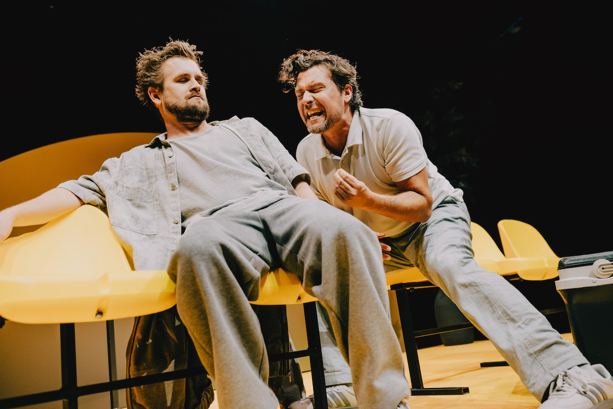 So wie der Titel des Stücks auf ein Ende hinweist, sieht auch die Bühne aus. Eine karge Schräge mit abgebrochenen Plastikstühlen, einem Fahnenmast ohne Fahne und einem traurigen Busch. Ergraute Kleidung, die Daniel Seniuk und Eric Wehlan so aussehen lassen, als müssten sie nur lange genug stillhalten, um vollends geisterhaft zu zerfließen. Dabei gelingt es den beiden Schauspielern, die Schwermut, die sie bedeckt, unterhaltsam und energetisch auszugestalten.