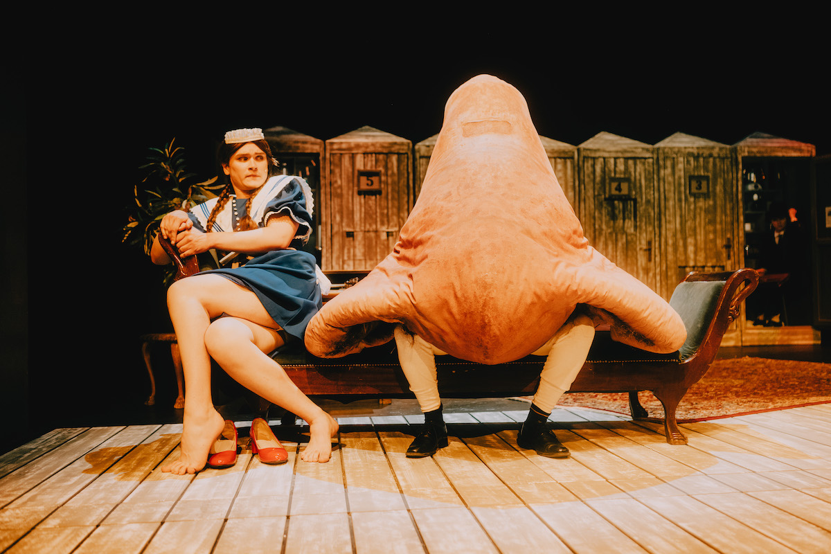 In diese Analyse von Kafkas Realität blühen und brechen die Erzählungen hinein. Die Sängerin Josefine etwa entfaltet sich aus einer der Kabinen als zartes Wesen aus flatterndem Chiffon mit einem Kopf aus Gips. Puppenspiel, eine Addition, die Düffel sich für Bamberg sehr gewünscht hat. Der Schreckmoment, in dem ihr Kopf auf dem Boden zerbirst, wird gleich zum Lacher, als ihre Scherben wortwörtlich unter den Teppich gekehrt werden.