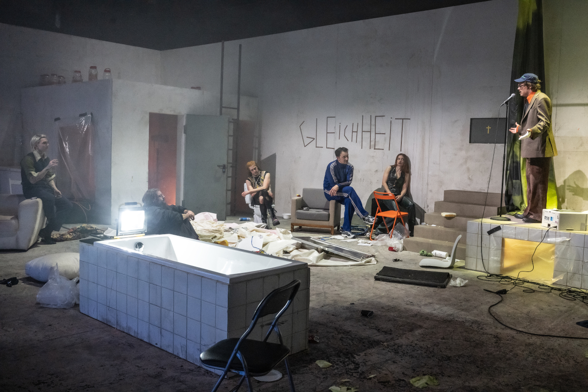 Weiss' Text ist einerseits eine sehr verkopfte Übung. Andererseits war der Autor auch bildender Künstler und geht so weit, in den Regieanweisungen konkrete Tableaus abzurufen. So soll Marat im Sterben ausdrücklich das Gemälde von Jacques-Louis David nachstellen. Bossard und ihr Ensemble verwandeln das Stück in ein Wimmelbild aus irren Momenten, Musikeinlagen, Kabbeleien und Gerammel. Da plumpst ein Laserdrucker in die Badewanne und lässt die Lampen flackern, warum nicht. Wenn Marat und de Sade sich auf ein fleckiges Sofa quetschen und ins Mikro sprechen, fallen sie in den Duktus von zwei Podcast-Bros. Scharf und Rüppel lassen Weiss' Blankverse klingen, als suchten sie spontan einen guten Gedanken.