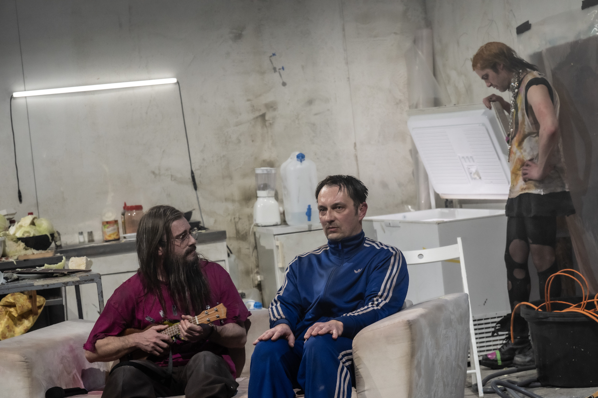 Das Ensemble bewegt sich in einer ranzigen, abgenutzten WG voller Sperrmüll-Mobiliar. Die Bühne von Romy Springsguth ist nicht einfach unordentlich, sie ist voll wie eine Wohnung, in der seit Jahren niemand Bock auf Aufräumen hatte. Ständig klebt jemandem was am Schuh oder man stolpert über Gerümpel. Kohlköpfe werden in der Luft mit dem Beil zerteilt. Sie stehen für die massenhaften Hinrichtungen, für die Marat verantwortlich gemacht wird. Aber was hat es mit den Kimchi-Kanistern auf sich, die überall herumstehen? Gären hier die Opfer der Revolution vor sich hin? Wir bekommen mehr Motive serviert, als wir verdauen können.
