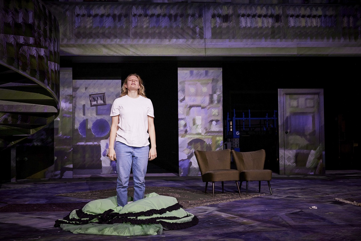 Hier setzt die Schöpfung von Ivana Sokola und Jona Spreter an, die der scheidende Schauspielchef Jan Philipp Gloger für seine letzte Inszenierung am Nürnberger Staatstheater gewählt hat. Der Vorhang hebt sich, das opulente Bühnenbild mit Treppenaufgang und Galerie, mit Grammophon, Ledercouch und schwerem Mahagonischreibtisch ist an die Filmkulisse angelehnt, dann wiederum verschwommen, teils von Glitches durchsetzt wie in einem Computerspiel. Darin warten die Männer auf Eliza: Higgins im Schlafrock, aber mit Fliege, ihr Vater im Anzug. Sie warten seit hundert Jahren auf ihre Rückkehr, während Miss Pearce wie auf einem Laufband hin und her gleitend die Galerie abfeudelt. Sie vermissen Eliza so sehr.