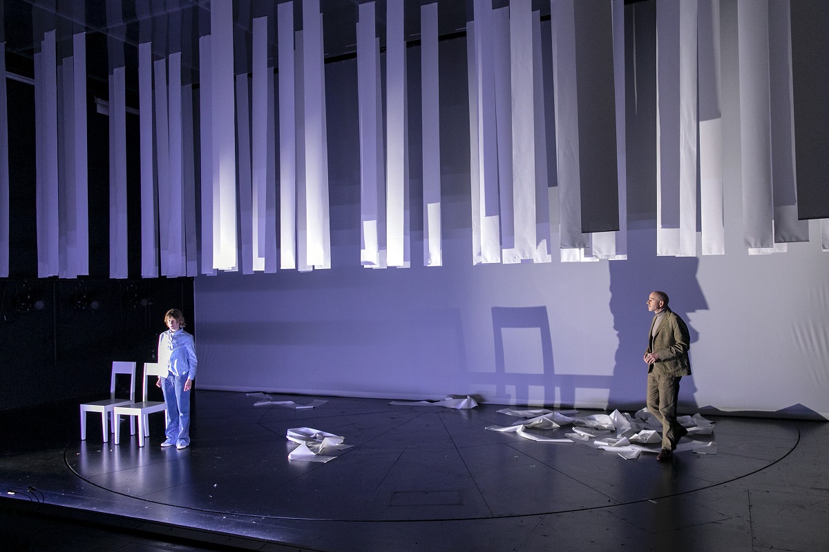 Durch dichte Bahnen aus weißen Lamellen schleicht sich Herwigs Stasi-Mann immer wieder aus dem Hintergrund auf die Bühne und in Karins Leben. Er bietet er die Schulter zum Anlehnen und die warmen Worte, die sie in ihrer Familie vermisst. (Der Vater ist in der Bühnenfassung komplett abwesend.) Roman und Theaterabend erzählen, wie die unsichere junge Frau in die Fänge der Stasi gerät, Leid bei Freunden anrichtet und einen überraschenden Ausweg findet. Zu leise anschwellender Musik von Fabian Kuss und in heruntergedimmtem Licht von Frédéric Dautier wird aber auch diese dramatische Zuspitzung des Plots ganz nüchtern-beiläufig im Kammerspielton erzählt, der die 230 Romanseiten und die zwei Theaterstunden prägt.