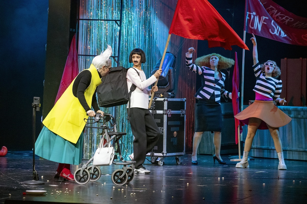 Am Gorki ist aber nicht nur ein Aufguss der Klassismus-Farce zu sehen, sondern eine aktualisierte und ergänzte Neufassung, die den Titel "Café Populaire Royal" trägt. Was ist neu an dieser Berliner Fassung? Zunächst zahlreiche Anspielungen auf Lokalkolorit, auf den Umbruch in Mitte, das seit Underground-Parties im Tacheles der 1990er Jahre kaum wiederzuerkennen ist, auf die Gentrifizierung im Schillerkiez, und auf Mariendorf, jwd am Ende der U6, als neuer Schauplatz der Zürcher Satire. Eine neue Background-Story bekommt Püppi (Çiğdem Teke), die hier eine Revoluzzerin mit Rollator und Rote Zelle Germanistik-Vergangenheit in der Rostlaube der FU Berlin ist. Als Running gag wird immer wieder eine fiktive 10. Klasse aus der Gropiusstadt im Publikum angesprochen. So weit, so amüsant.