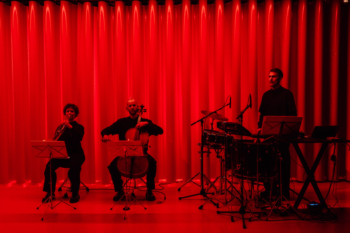 26. Oktober 2025. "Fa – Fa – Fa" beginnt es lautmalerisch wie enigmatisch. Countertenor Steve Katona intoniert die Silben mit bebenden Lippen, die so recht zunächst noch nicht einzuordnen sind. Das Ambiente ist minimalistisch, Rot die vorherrschende Farbe: rot ist der Boden im Studio des Maxim Gorki Theaters, rot ein dicker Vorhang aus Kunststoff, der sich symmetrisch hinter dem Geschehen wellt. Davor haben kurz zuvor statuarisch gemessenen Schritts drei Musiker*innen ihre Plätze eingenommen: eine Hornistin (Elena Kakaliagou), ein Cellist (Guido Kohn) und hinter seinem elektronischen Equipment Andrea Belfi, der auch den Sound für diesen Abend von Nazanin Noori auf der Basis von Gedichten Paul Celans komponiert hat.