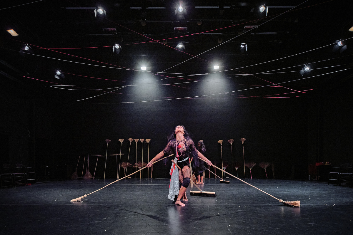 Davor haben die beiden von billigen Haushaltshilfen von den Philippinen und aus Sri Lanka erzählt, von Missbrauch, Vergewaltigung und Mord. Und sie haben gefegt, erst leise, zaghaft, dann zu brezelnder Elektro-Musik, immer den Besen zwischen die Beine geklemmt, hinten ragt er als reinigender Schwanz hervor, und zwischendrin entwickelt sich – mit teilweise bis zu sechs Besen, die gleichzeitig geschwungen werden – das ganze zu einem regelrechten cirque du balai. Aber eben mit ernstem Hintergrund: Am Ende baumeln die Besen als gehängte Hexen – metaphorisch übereinanderlegt mit den missbrauchten Haushaltskräften – von der Decke.