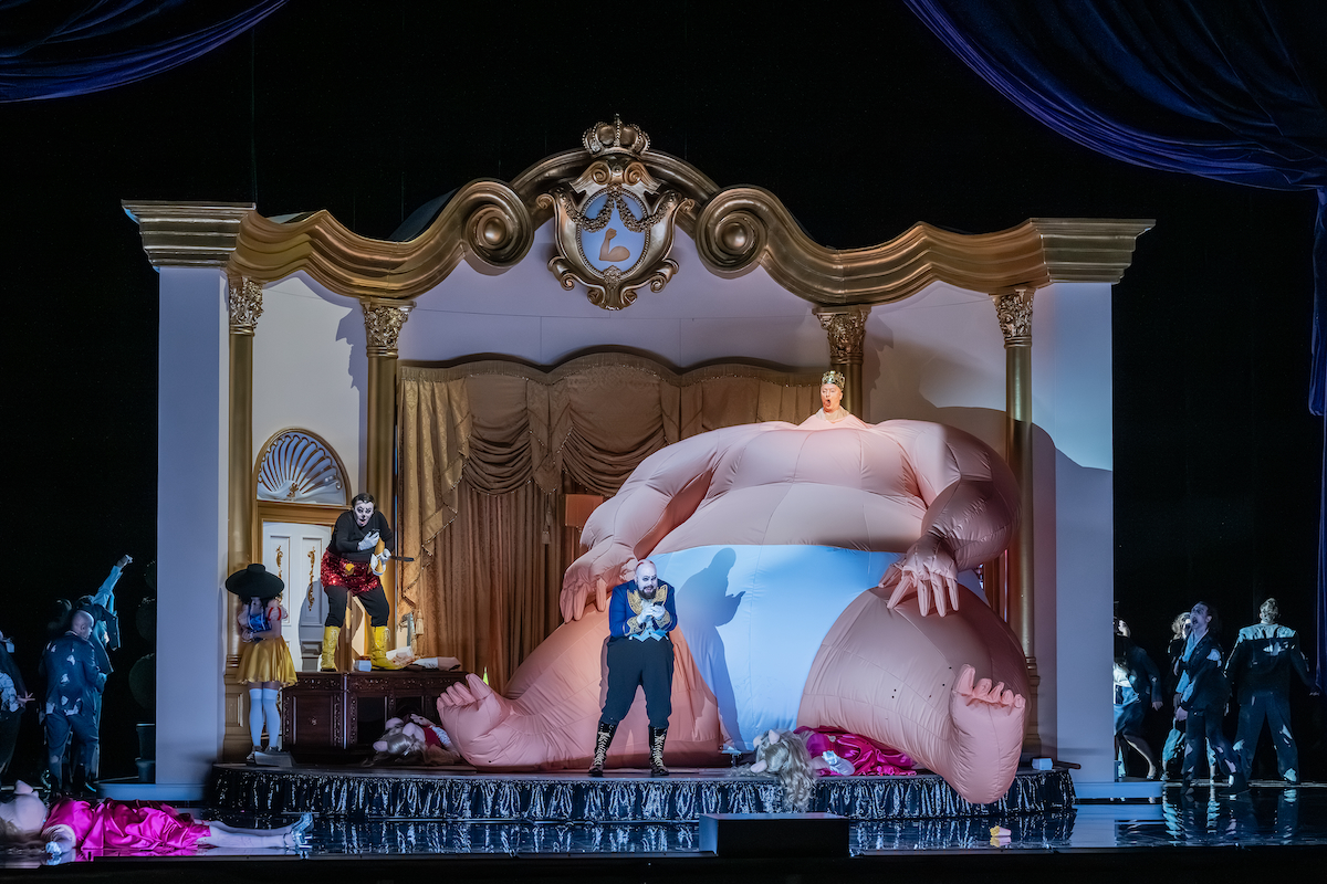 Als letzter Versuch soll einem im vergoldeten Palast kindisch vor sich hinquengelnden "König-Präsidenten" (Georg Nigl, Bariton) das Handwerk gelegt werden, was aber auch scheitert: Vampi und Bampi bekommen nicht einmal ein Attentat hin, stattdessen geht der Unhold gestärkt aus dem Angriff hervor und mobilisiert seine Zombie-Anhänger (Chorleitung: Christian Günther). Das ist nicht weiter schlimm, weil der "König-Präsident" bald darauf vom Seeungeheuer Gorgonzilla (Anna Clementi, elektronisch verfremdeter Mezzosopran, gespielt von Vanessa Konzok) gefressen wird (was langfristig natürlich auch keine Lösung ist). Und Charlotte Rampling rezitiert als "The Goddess" salbungsvoll Kalendersprüche per Videoeinspielung.