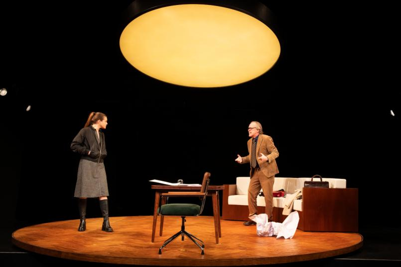 Selbstsicher bewegt sich Sven-Eric Bechtolf als John durch diesen Raum. Was hat er schon zu befürchten? Seine Professur auf Lebenszeit ist greifbar nah und auch der Hauskauf für die Familie. Seine zurzeit einzige Sorge ist, sich beim Termin mit Ehefrau und Maklerin zu verspäten. Wäre da nicht die Studentin Carol – von Johanna Asch mit enormer Präsenz gespielt. Eine Weile schon steht sie am Bühnenrand und wartet auf ein Gespräch. Dass sie darin die Note für ihre letzte Klausur wissen will, wird man erst eine gefühlte Ewigkeit später erfahren. Denn bis sie ihr Anliegen äußern kann, ergießt sich der Professor in selbstgefälligen Monologen, immer mal wieder unterbrochen von genüsslichen Bissen in die mitgebrachte Stulle oder privaten Telefonaten.