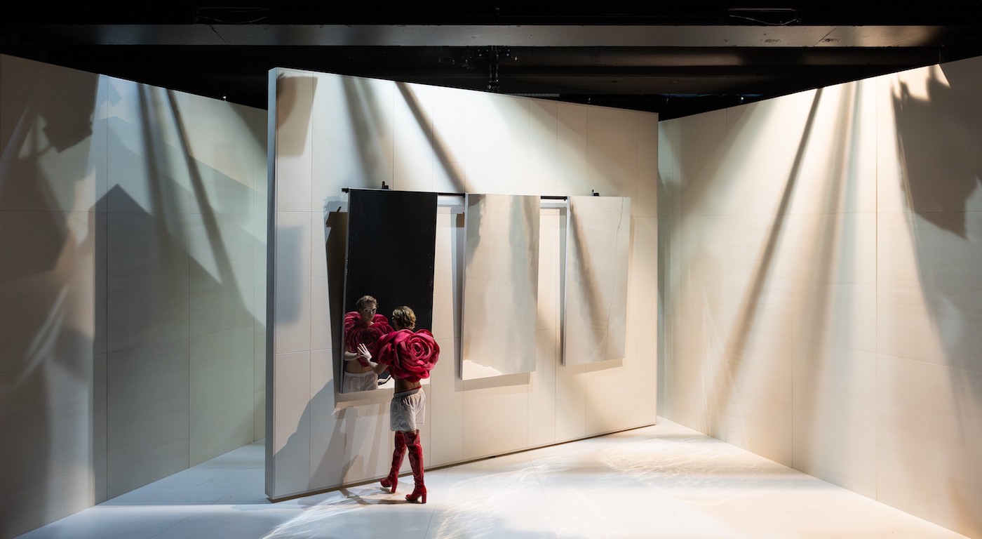 In diesem Zurechtrücken der Vorlage ist Ran Chai Bar-zvi also nahe an Wilde, ansonsten aber verzichtet er auf Fin-de-Siècle-Plüsch. Die vom Regisseur selbst gestaltete Bühne betont die Nüchternheit des White Cube (wir befinden uns hier zweifellos im Galerie- und Kunst-Kontext), während die von Belle Santos entworfenen Kostüme die Kälte des Raums fröhlich mit Lack und Latex fetischisieren. Das Setting, das bei Wilde noch zurückhaltend homophil angedeutet wurde, ist hier explizit queer: Dorian (zum Niederknien schön: Mitja Over) steht dem Maler Basil (ernsthaft in Dorian verliebt: Miguel Klein Medina) Modell, während dessen älterer Freund Harry (Stefan Graf) halb belustigt, halb eifersüchtig die Annäherungen der beiden kommentiert. Das ist charmant, weil die Inszenierung hier die von Wilde gepflegten Aphorismen und die Kunst des Smalltalks so glaubhaft wie unterhaltsam in die Welt des Flirts überträgt.