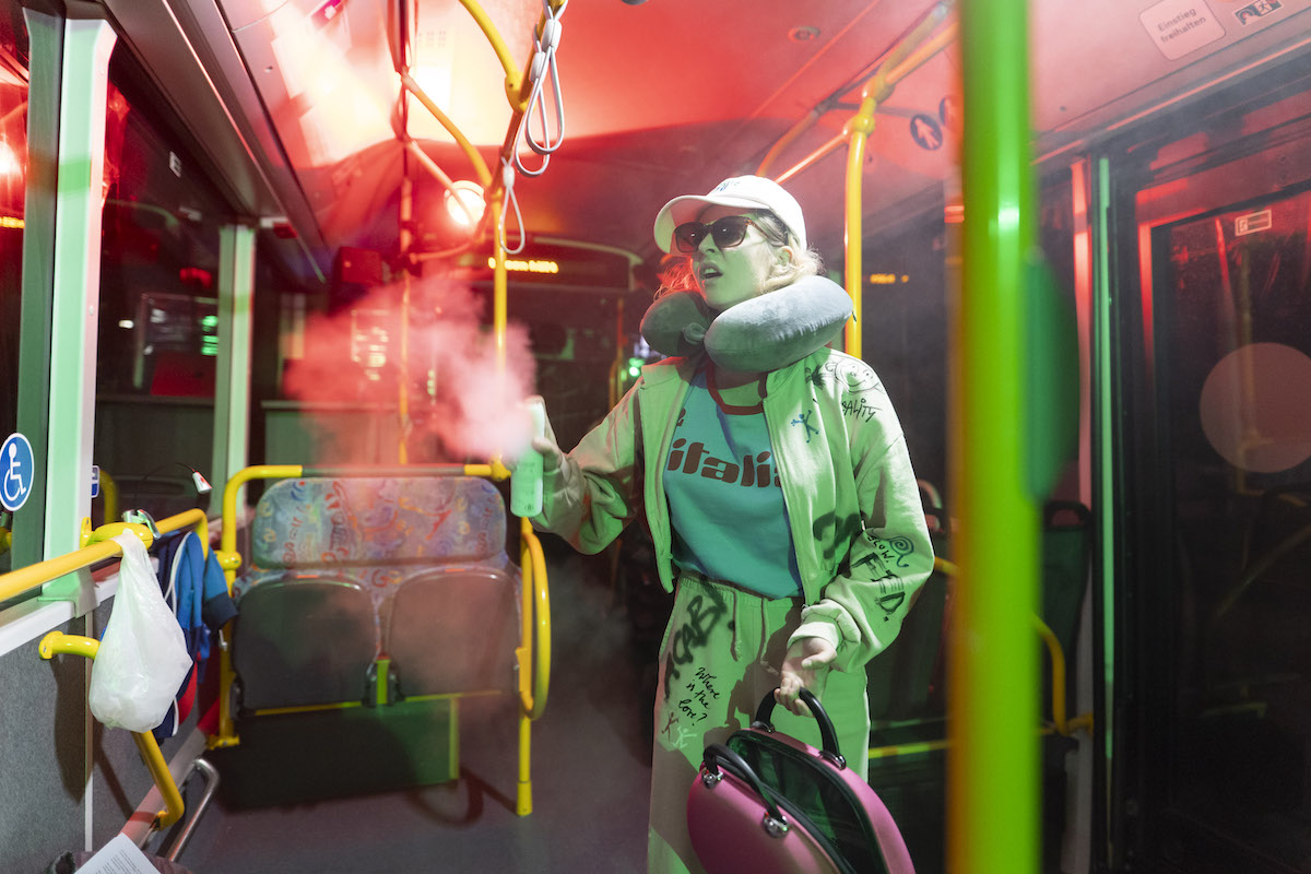 Den roten Faden in dieser Performance-Collage gibt es nicht. Allenfalls aus dem Off. Anfangs wird über Buslautsprecher und Tonband noch eine Polizeikontrolle des Nachtbusses an einer Grenze zu Deutschland eingespielt. Darauf spricht ein Kind mit seinem Vater über die Polizei als freundliche Helfer, die einen mit der Kelle durchwinken. Andere allerdings auch ausgrenzen. Das Kind wird stutzig – "Gehören wir hierhin?" – und denkt laut darüber nach, dass es selbst zwar mit deutschem Pass frei reisen kann. Doch gilt das auch für die Mutter, die außerhalb von Deutschland geboren wurde? Diese grundsätzlichen Fragen der Zugehörigkeit und Identität wird gebrochen durch eben jene Touristin, mit "italia" auf dem Trikot, die den Polizisten einfach nur "scharf" fand. Hibbelig und privilegiert, das kennzeichnet diese Person, die sich am Businnenspiegel die Lippen rot nachzieht.