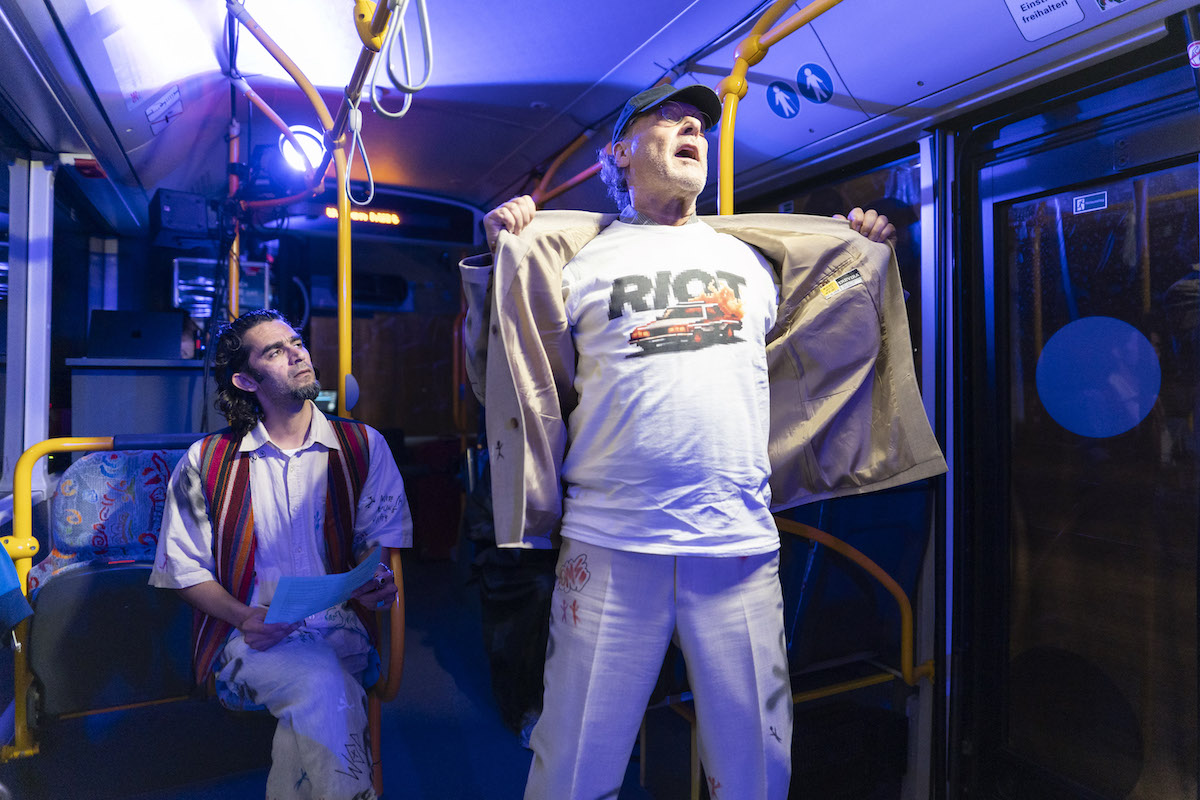 7. Juni 2025. Draußen ist es noch hell. Drinnen im Nachtbus sind die Fenster abgehängt. In simulierte bedrohliche Enge holt der aus dem Iran stammende Regisseur Izad Safaeiyan das Stück von Allex. Fassberg "Etwas kommt mir bekannt vor" und vereint Menschen, die hier viel voneinander erfahren.
