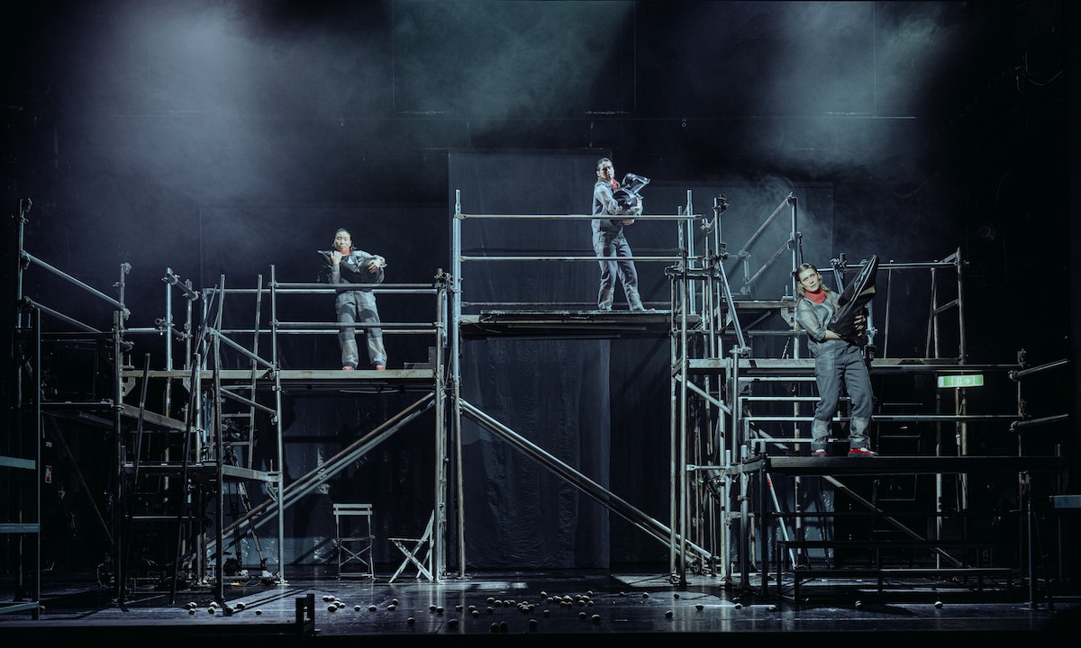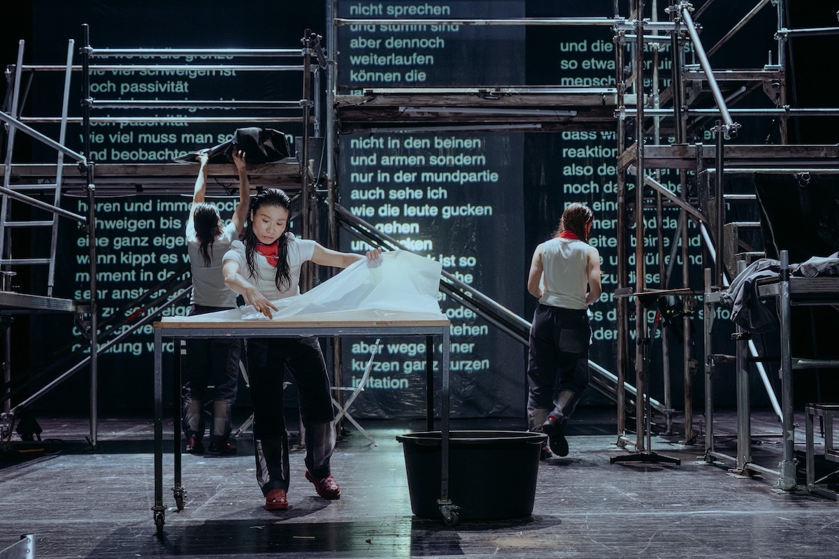 Dazu später. Der Abend beginnt im Foyer des Staatstheaters Wiesbaden. Die drei Schauspielerinnen Trang Dông, Laura Talenti und Süheyla Ünlü mischen sich unters Publikum. Sie tragen graue Arbeiterkluft und rote Tücher um den Hals und glänzen wie frisch eingecremt. Dezent nehmen sie Kontakt auf, sprechen von sich und den anderen, schreiten vom Ich zum Du und bauen ein Vertrauensverhältnis auf. Kurze Zeit später winken sie die Masse ins Kleine Haus. Dort wartet ein großes Gerüst im Bühnennebel und die drei beginnen zu erzählen vom Anwerbeabkommen und den so genannten Gastarbeitern, die ab den 50er Jahren nach Deutschland gekommen sind, erst aus Italien, später auch aus der Türkei. Von angeworbenen Händen ist bei der preisgekrönten Autorin Özlem Özgül Dündar die Rede und von angemieteten Körpern. Von Menschen, die wie Pflanzen umgetopft worden seien und von Fabrikarbeit im Akkord.