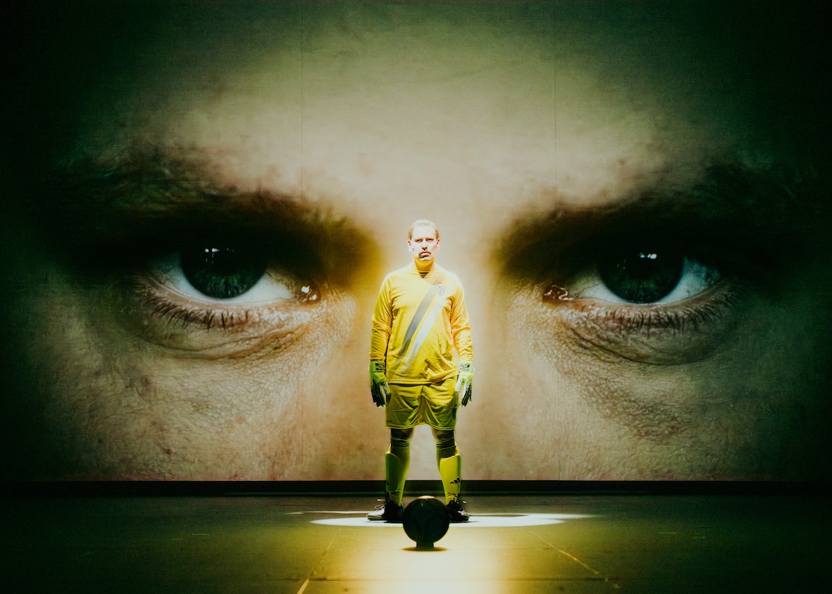 Die Rückwand beherrscht ein grünliches Schneegestöber, oben thront eine Uhr, die den Abend in zwei Halbzeiten, samt Nachspielzeit und einer Pause teilt. Einer mäht den Rasen, während Torwart Fred (lässig gespielt von Lasse Boje Haye Weber) merkwürdig versunken in der Ecke hängt. Die Traumhaftigkeit der Szene markiert ein Gazevorhang, der auch am Ende des Stücks ("Ein Traum, was sonst?") zuzieht.