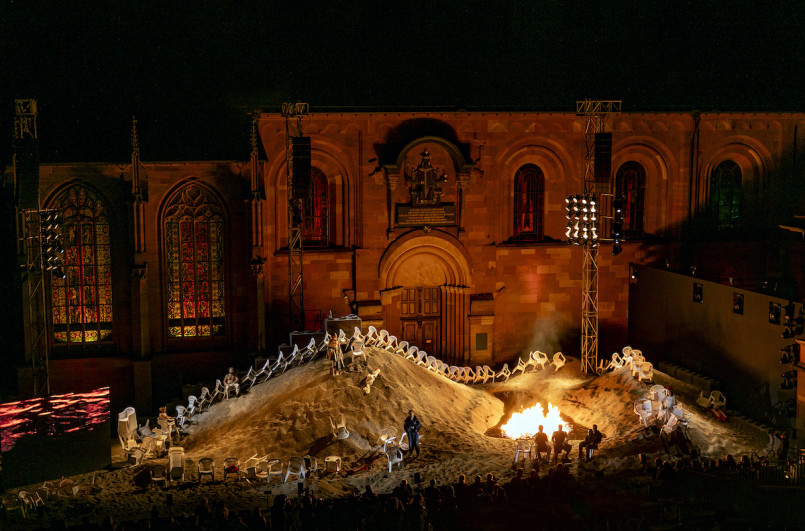 Worms, 12. Juli 2019. Bei den diesjährigen Nibelungenfestspielen lernt das Publikum: Königin Brünhild kommt gar nicht aus Island, sondern aus Isenburg an der Ruhr. Der Drache, in dessen Blut Siegfried angeblich gebadet hat: Nur eine Echse. Das riecht nach Sakrileg – und in der Tat haben Autor Thomas Melle und Regisseurin Lilja Rupprecht vor dem Wormser Dom nichts anderes vor, als den Stoff hops zu nehmen.