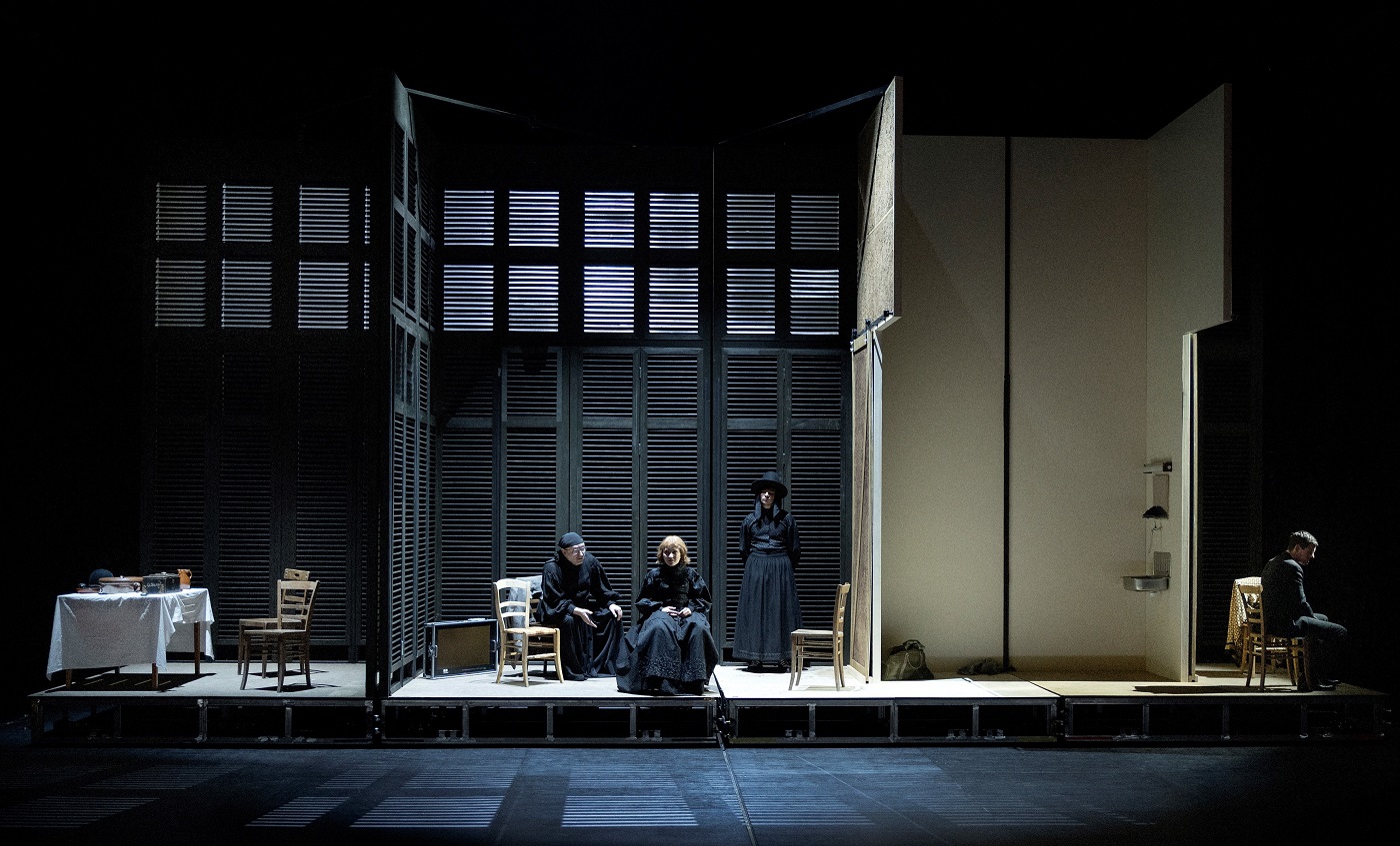 Die Inszenierung von Mateja Koležnik macht den Text letztlich besser, als er ist. Denn sie rückt ihn schon optisch in die Distanz. Das Bühnenbild von Raimund Orfeo Voigt ist eine hohe Box mit jalousienartigen Wänden, deren Segmente sich drehen und isolieren lassen; so rücken immer unterschiedliche Personenfiguren in den Fokus. Und das Kostümbild von Ana Savic Gecan, schwarze Roben, Röcke, Hüte, gibt den Figuren die Anmutung einer religiösen Sekte, einer Art Amish People.