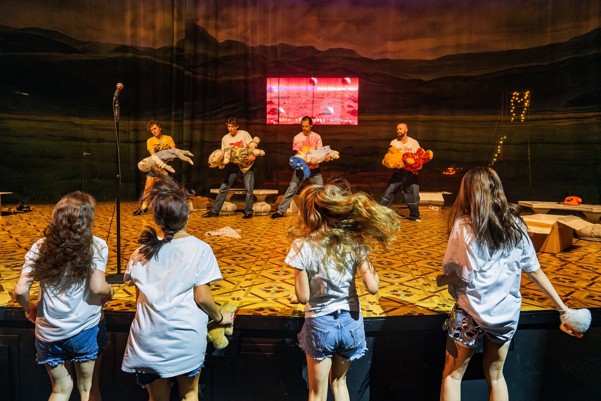 Im Bühnenbild von Johanna Trudzinski: Katharina Klos, Dominik Dos-Reis, Kaja Gruba, Marius Huth, Lukas von der Lühe, Tabea Zoí Sander, Risto Kübar, Şevval Ertürk © Fred Debrock