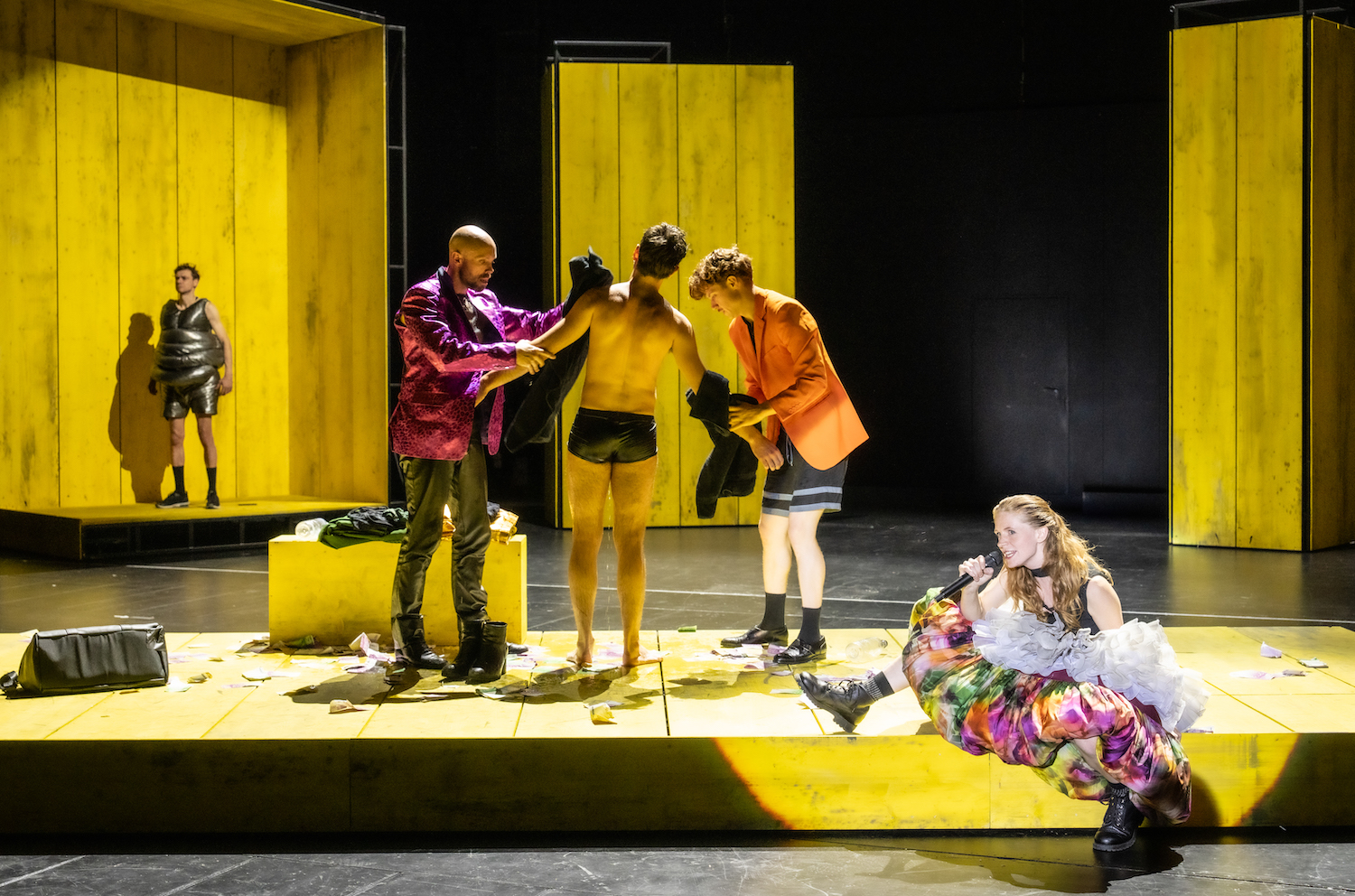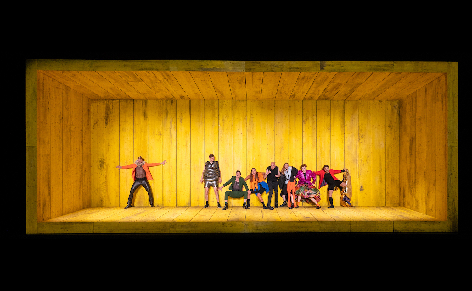 Tilmann Köhler hat nach der Uraufführung im Residenztheater München in Bonn nun die zweite Aufführung von Palmetshofers großem Werk inszeniert. Dazu hat er sich von Bühnenbildner Karoly Risz eine große gelbe Bühnenkiste bauen lassen. Schmal ist die Spielfläche und oben und unten eingekastelt. Nur in der rückwärtigen Bretterwand öffnen sich hin und wieder Tore. So ist kein szenisches Spektakel hier zu erwarten. Nur direktes Spiel, schnell, ohne großen Aufwand und mit viel Witz. Und Sprache. Die Holzkiste ist auch ein Resonanzboden. Palmetshofer hat versucht Shakespeares mit Metaphern sich überschlagende Sprache in ein heutiges Idiom zu übersetzen, oft in Jamben, Wortstellung verdreht. Es ist ein rasantes Gemisch von alter Sprachkunst und neuestem Jargon, das in der Bonner Bretterbude fetzig und präzise hörbar klingt.