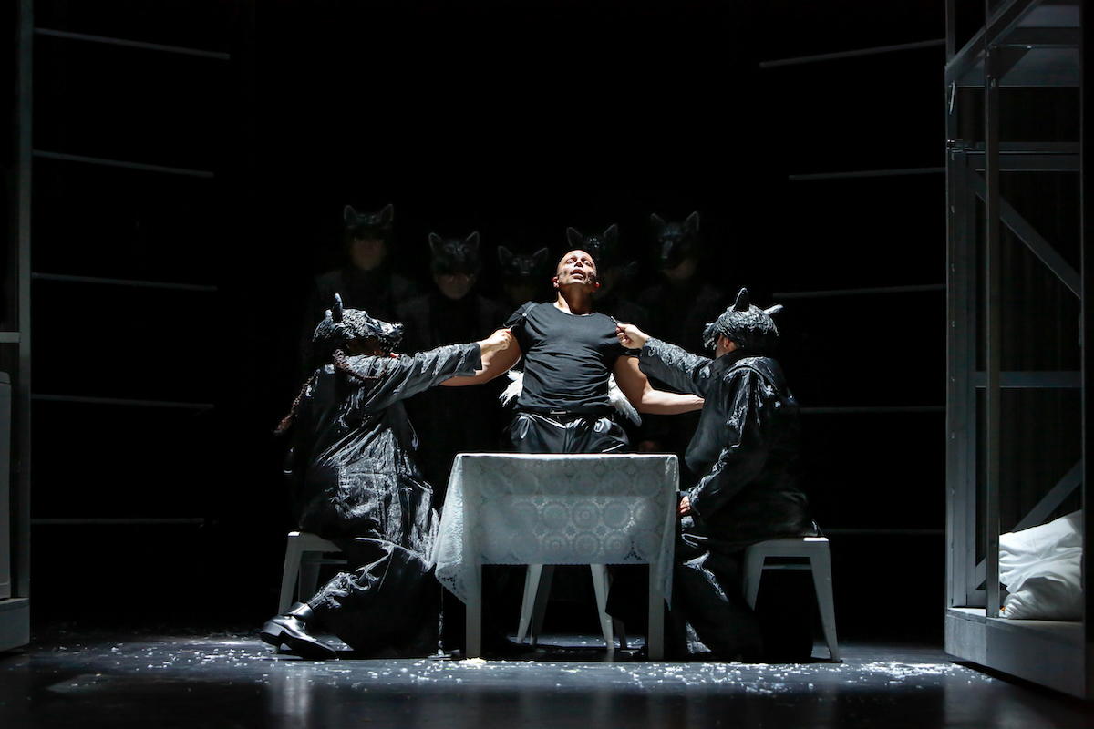 Auch die Szenen, in denen Peter zunächst auf den Wolf und später im Lager auf Ilya trifft, entspringen letztlich der Imagination von Peters Sohn. Diesen Aspekt des Stücks betont Weisskirchen durch Vorausdeutungen. So wird etwa aus dem Taxifahrer, der Peter zum Wolf bringt, ein ganzer Wolfschor, eine achtköpfige Gruppe von Menschen, die Wolfsmasken tragen und später die übrigen Besucherinnen und Besucher der Taverne sein werden, in der Peters Sohn seinen Geburtstag feiert. Und es sind auch diese acht Schergen eines faschistischen und oppressiven Systems, die Ekkehard Freyes Ilya in einer stilisierten Szene brutal zusammenschlagen. Diese von Weisskirchen ersonnene Traumsequenz ist zugleich eine Vorahnung und ein überaus eindringliches Bild für das System, das Sam Max und die Inszenierung nachzeichnen.