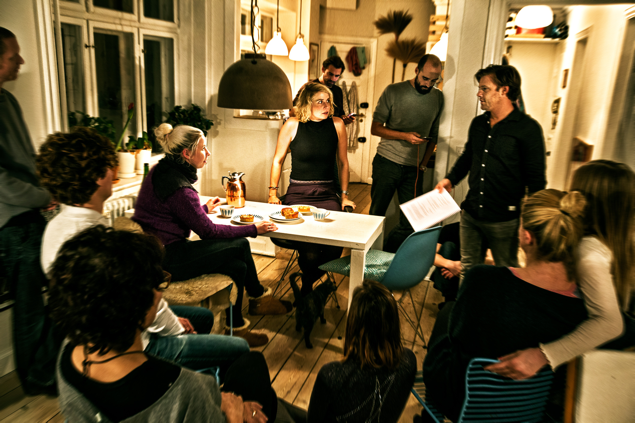 Dies ist die letzte von vier Vorstellungen, auch die drei Gastgeber-Paare der vorigen Festival-Tage sind dabei; etwa vierzig Menschen finden Platz an Tischen und auf Sesseln und Sofas in beiden Wohnräumen, in der großen Küche und auch noch draußen auf dem Balkon mit Blick auf Innenhof und Garten.