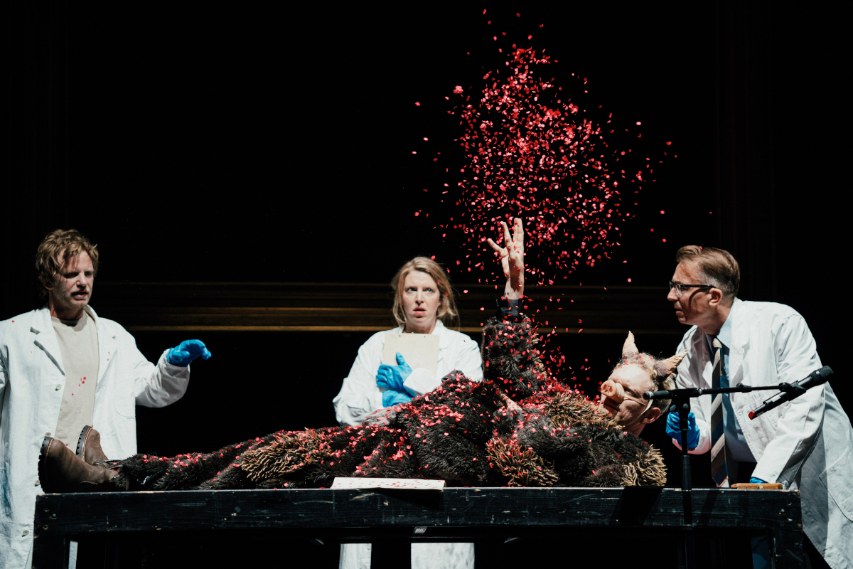 Kein Wunder, dass ein solches Tier für Aufsehen sorgt und quer durch die Stadt gejagt wird. Begleitet vom "Tatort"-Soundtrack kann man das auf der golden eingerahmten Leinwand verfolgen, ehe das arme Tierchen von den drei es jagenden Geschwistern Maxim (Christian Bo Salle), Maxi (Katharina Rehn) und Max (Pascal Riedel) ins Theater und dort gleich auf die Schlachtbank gezerrt wird, um ihm mit martialischen Werkzeugen zu Leibe zu rücken.