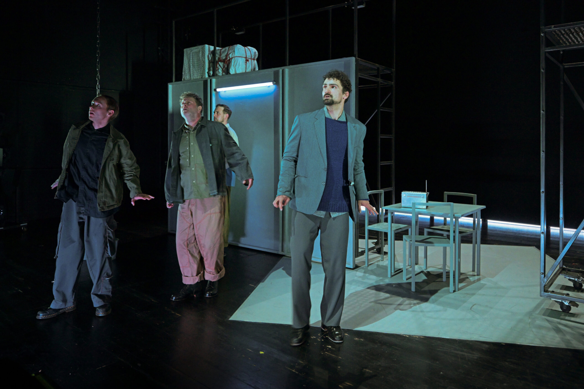 Dort inszeniert der junge Regisseur Luis Dekant das eindringliche Kammerspiel in der kleinsten Spielstätte U17. Zwei mobile Metallgerüste markieren das Innere des Schiffsbauchs, in dem wir uns befinden. Auch wenn die Spieler:innen sie gelegentlich verrücken: einen Ausweg gibt es hier nicht. Carl (Carl Grübel), der Sohn des Kapitäns und Leichtmatrose, hat den Fliehenden an Bord geholt. Rasch sorgt seine Anwesenheit für Zerwürfnisse unter der Besatzung. Schwester Nina nimmt ihn in Schutz, ihr Verlobter, Steuermann Jürgen (Béla Milan Uhrlau), ist eifersüchtig und wäre den Eindringling gern los. Kapitän und Vater Petersen (Holger Kraft) hält sich gern ans Gesetz und hadert mit dem Regelbruch.