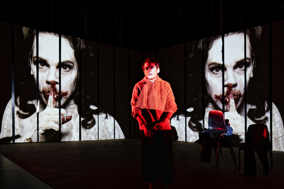 So geistert seine demente Oma durch die Bäume. Die Projektionen strukturieren den Abend und sind kunstvoll montiert: wackelige, schnelle Einstellungen von einer Halloween-Party wechseln sich ab mit minutenlangen Close-Ups einzelner Spieler*innen, die sich die Cam weiterreichen, einmal zocken alle gemeinsam ein Videospiel, sogar ein paar Jumpscares mit riesigen Mündern sind dabei. Es ist die Unmittelbarkeit des Geschehens, die Jan Friedrichs Abende so fesselnd machen.