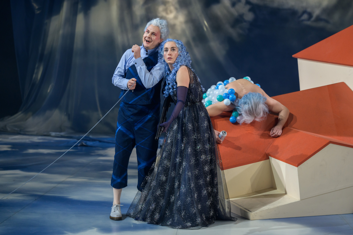In einer verrückten Welt: Christian Bayer als Malvolio, Johanna Geißler als Olivia, Krunoslav Šebrek als Sir Toby Rülps in "Was ihr wollt" in Weimar © Candy Welz