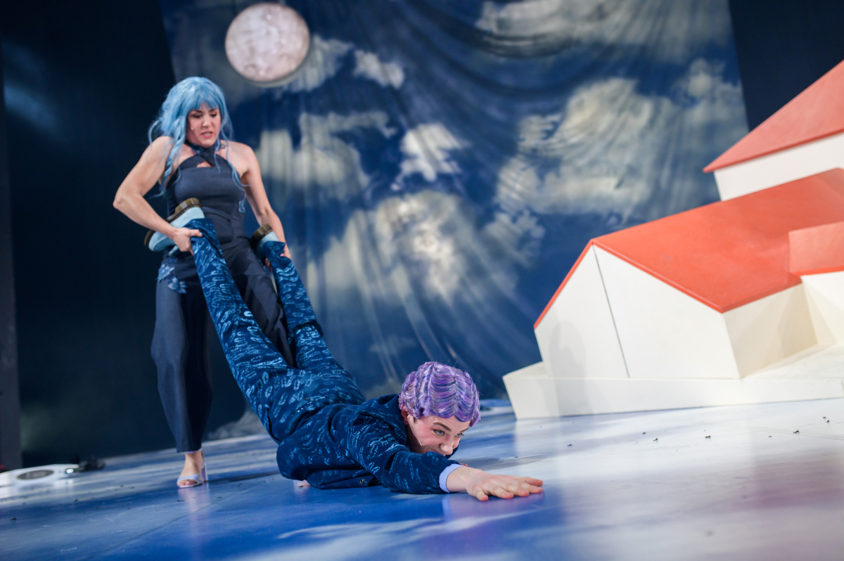 2. März 2025. Illusion und Täuschung sind der Stoff, aus dem Theater gemacht ist. Damit das Publikum in der neuen Produktion des Nationaltheaters Weimar nicht vergisst, wo es sich befindet, ist ein Modell des ursprünglich monarchisch-bürgerlichen Musentempels auf der Bühne platziert. Ein schräg gestelltes Baumonster. Auf dessen roten Dächern und auch drumherum geht die Post ab. In luftiger Höhe klettern, rutschen und balancieren Schauspieler und Schauspielerinnen. Der Theaterkultur wird hier aufs Schönste aufs Dach gestiegen.