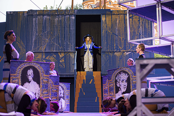 Melk, 19. Juni 2019. Da soll also ein himmelhoher Turm draus werden, aus diesen kubenförmig angeordneten, gegeneinander verschiebbaren Stahlgerüstmodulen. Vielversprechend. Aber weil wir in Babel oder "Babylon" sind, wird es letztlich nur ein Bühnenbild. Das sich gegen das durchaus vollendete Bauwerk dahinter sowieso bescheiden ausnimmt. Denn da thront das Stift Melk über der Donau.