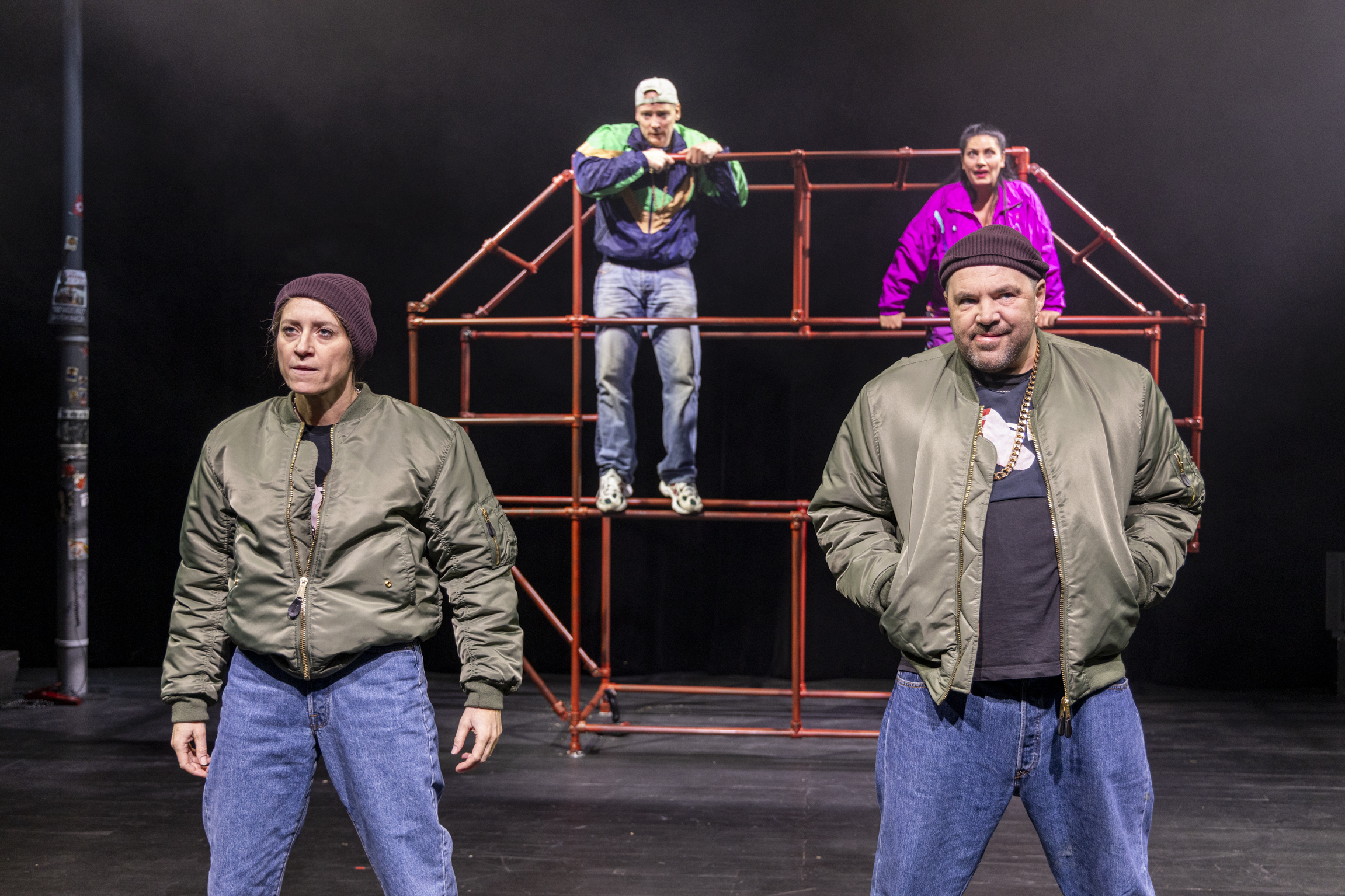 Während sich die Protagonisten durchs stählerne Klettergerüst hangeln – nach oben schauen und nach unten treten (Bühne von Monika Rovan) –, laufen auf zwei alten Röhrenfernsehern dokumentarische Aufnahmen zum jeweiligen Jahr des unfreiwilligen Zeitstrudels. Landesfahnen werden geschwenkt, die nur wenige Jahre zuvor kaum eine Rolle spielten, Kriegsgerät aufgefahren, das zuvor in den Kasernen verstaubte, und Leute erschlagen, die zuvor Nachbarn waren. Als hätte jemand den Gewaltcode für die Realität eingegeben, sagt Vanja, die im Buch und auf der Bühne als Erzählerin fungiert. Bei Videospielen umgeht der "Gewaltcode" den Jugendschutz, um das Pixelblut freizuschalten. So fühlt es sich für die Jugendlichen in der Zeit der Jugoslawienkriege an, verbunden mit dem Zwang, sich als zugehörig zu einem nationalen Kollektiv zu bekennen: "Auf wessen Seite wir stehen, das ist die Frage unseres Lebens."
