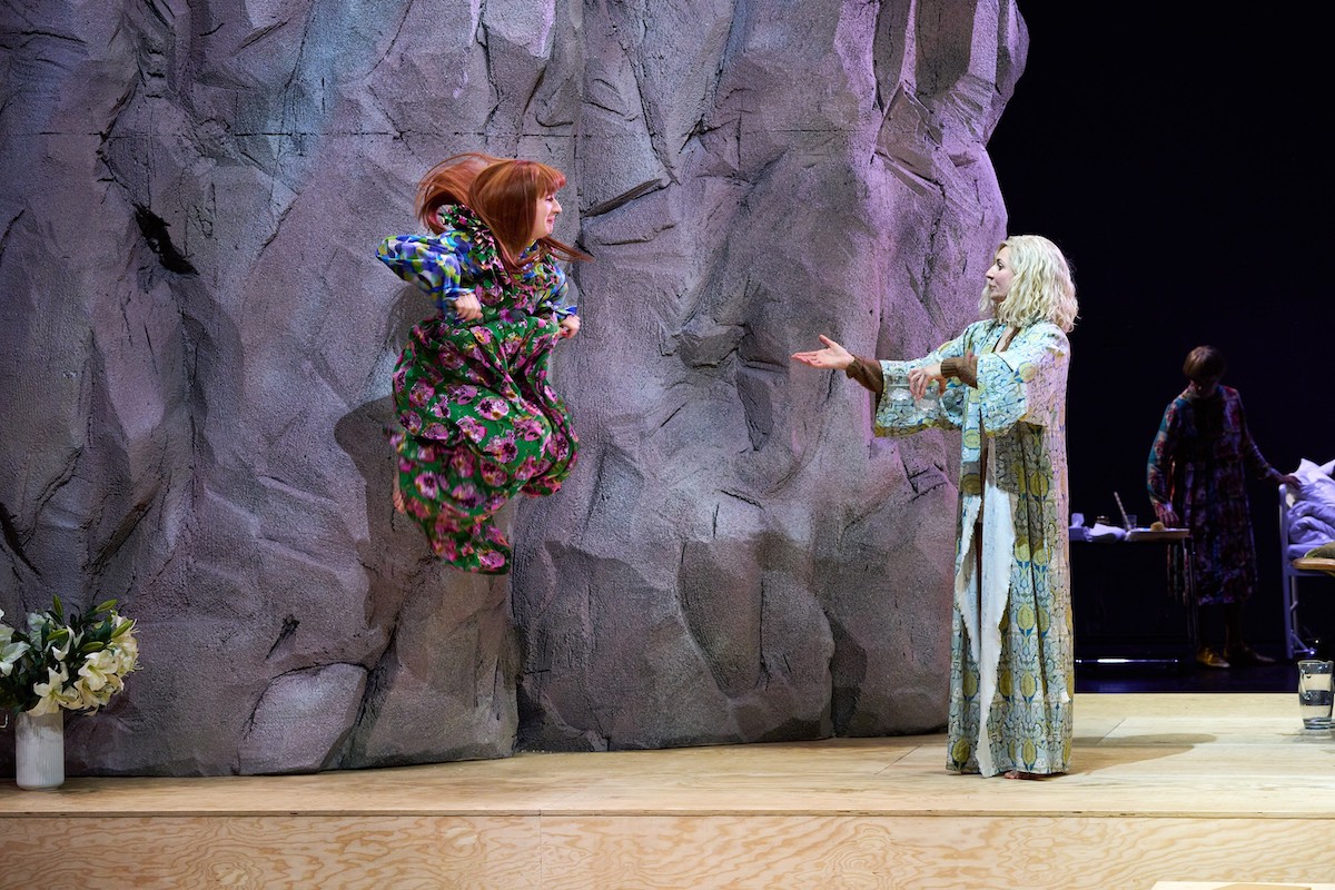 Die Inszenierung spielt in einer modernen Vergangenheit. Die anderen Figuren sind bunt gemustert, die Frauen tragen geblümte Kleider, die Männer flatternde Hosen und Hemden. Überall Naturmotive. Goetze hat dazu eine Art Loft-Atmosphäre auf die Bühne gestellt. Zwei mächtige Felsbrocken bilden schicke Wohnwände und teilen die Bühne in ein Vorne und Hinten. Von der hölzernen Decke hängt ein Design-Cheminée. Hinten lauert der Tod im Krankenbett. Vorne auf den hölzernen Stufen wäre das Leben. Doch niemand weiß, wie man das so richtig lebt und genießt.