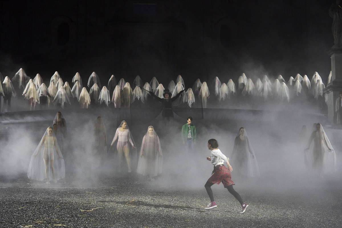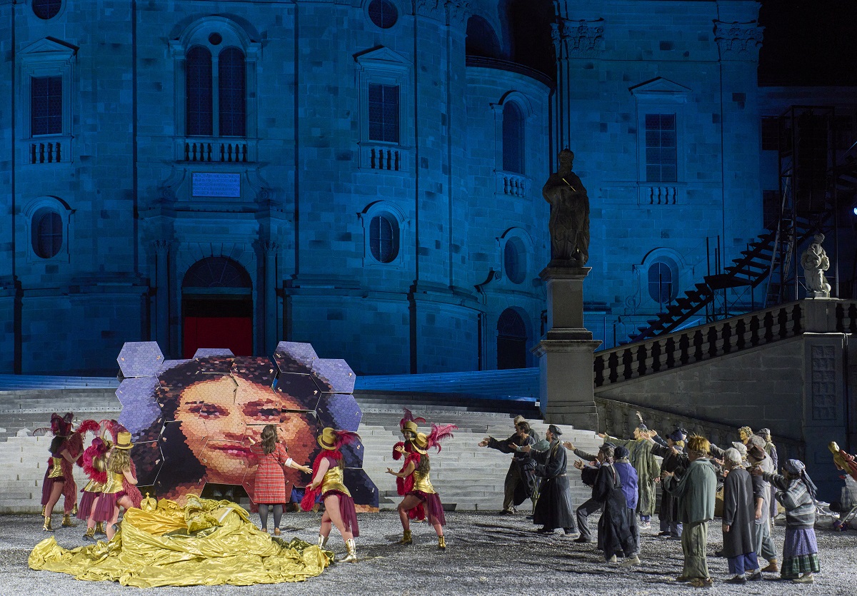 12. Juni 2024. Das Welttheater ist abgesagt. Der Autor – weißer Anzug, Hut und Stock – verkündet es mehrsprachig. König, Schönheit, Armer und Reicher, Bauer und Elender sind zwar schon auf den pompösen barocken Klosterplatz gezogen, auf dem man zwangsweise zur doppeltürmigen Kathedrale aufblicken muss wie ein kleiner Sünder. Aber sie werden nicht gebraucht (so wie die Klosterfassade durch die Raumnutzung weniger dominant wirkt als früher). Der Absage stellen sich Emanuela und Pablo entgegen: Sie, die ungeborenen Kinder, die noch nie spielten, wollen spielen! Und wenn’s sein muss, halt alle Rollen.