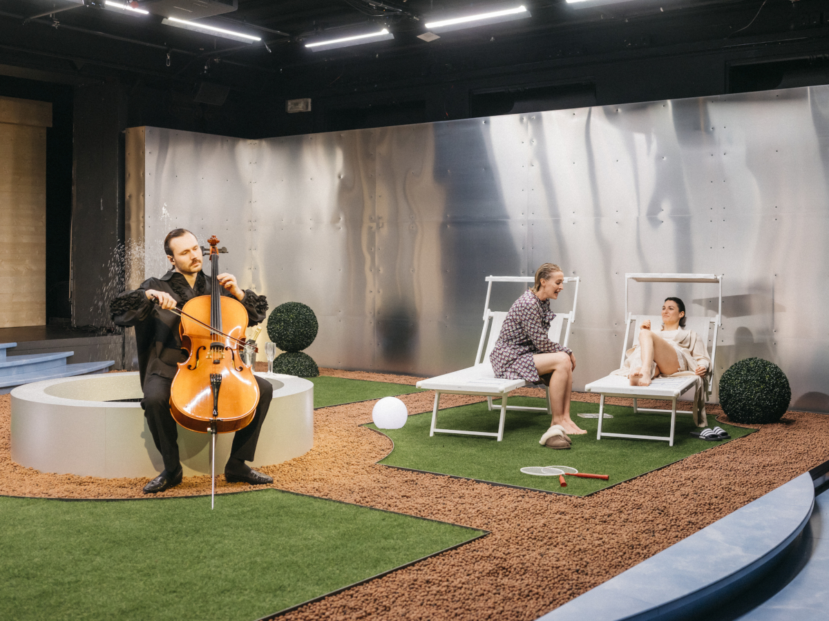 Dehnbare Diskursübungen im Bühnenbild von Noé Wetter: mit Melina Pyschny, Musiker Janos Mijnssen und Sofia Elena Borsani © Philip Frowein