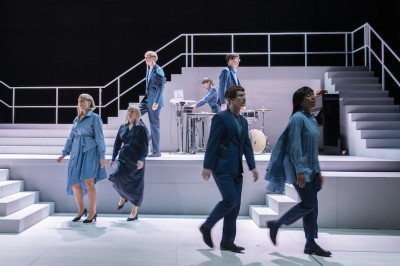 Oldenburg, 17. Juli 2021. Frisch gewählt sind die Damen und Herren, die da gerade Platz nehmen im Halbrund der Arena aus blauen Sesseln – im neuen Deutschen Bundestag, dem 19. Parlament seit 1949. Eine Wahlurne war zu sehen gewesen auf der Bühne, Menschen steckten weiße Zettel hinein; dann wurde die vom TV-Bildschirm vertraute Ergebnis-Grafik simuliert, und aus den Blöcken in Schwarz, Rot und Grün, Gelb und Blau gaben die führenden politischen Köpfe von CDU/CSU, SPD und Grünen, FDP und AfD per Video-Projektion die ersten Nach-Wahl-Statements ab. Schließlich schwor die Stimme des Parlamentspräsidenten Wolfgang Schäuble das Personal ein auf die parlamentarischen Regeln – und jetzt, bei Schäubles Rede, war erstmals (nach dem Einstimmen des Orchesters auf das nun beginnende Stimmengewirr) das Prinzip zu hören, auf dessen Basis der Berliner Komponist Paul Brody die "Demokratische Sinfonie" entworfen hat, die da als letzte Premiere der Saison am Staatstheater in Oldenburg zur Uraufführung gekommen ist. Sie ist ein musikalisches Abenteuer.