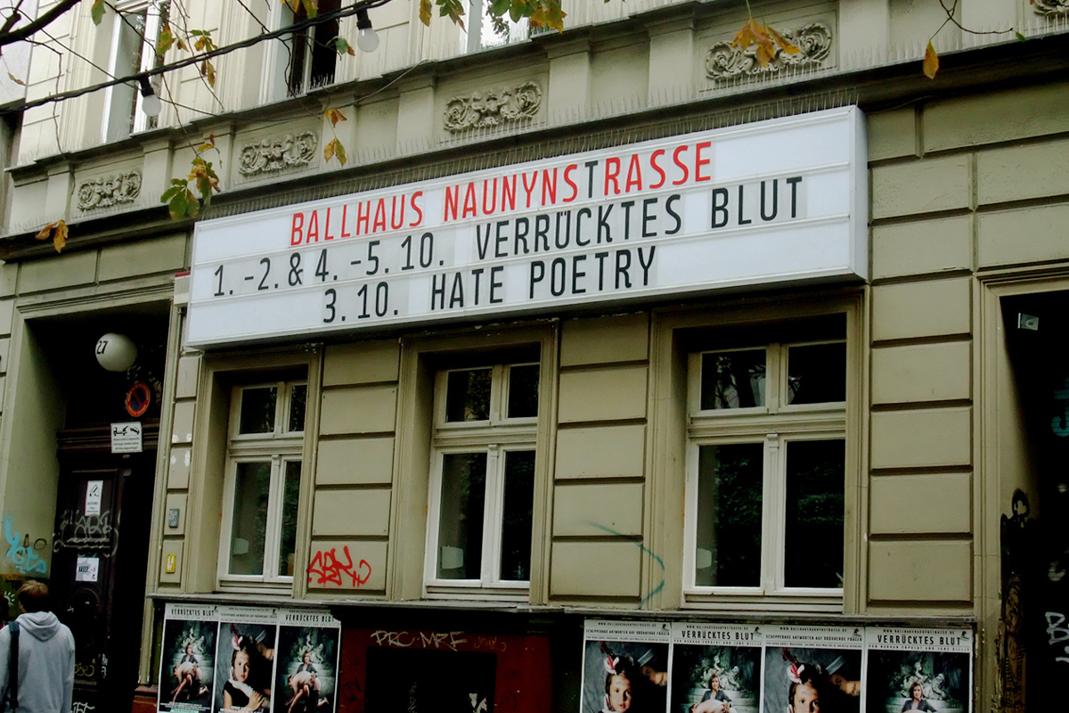 Das Berliner Ballhaus Naunynstrasse um 2010. Annonciert wird das Gründungsstück des postmigrantischen Theaters "Verrücktes Blut" © Ballhaus Naunystrasse