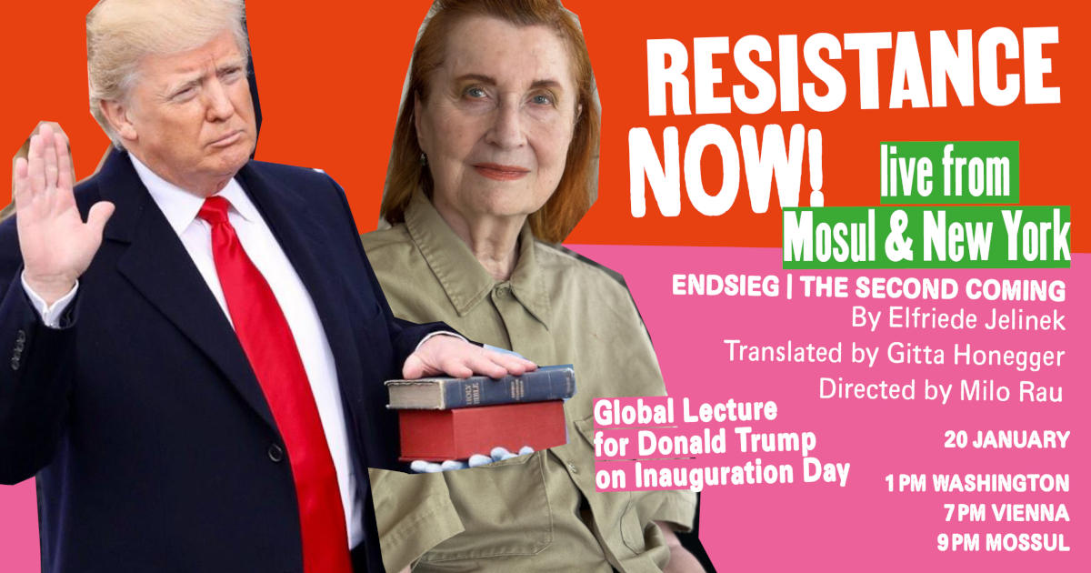 20. Januar 2025. Zur Amtseinführung von Donald Trump zeigen die Wiener Festwochen in Zusammenarbeit mit dem Martin E. Segal Theatre Center in New York eine Lesung live aus Mossul & New York: "Endsieg | The Second Coming" von Elfriede Jelinek in einer Inszenierung von Milo Rau.
