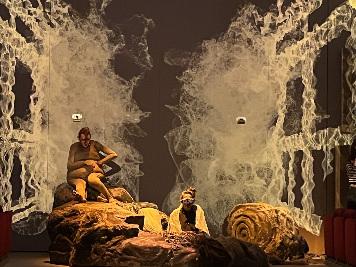 All das wird von animierten 3D-Projektionen (Lalin Akalan, Amir Ahmadoghlu) eingefasst, die den gesamten Raum ergreifen. Wasserfälle aus Licht, animierte Details der Raumarchitektur: die physischen Phänomene werden im Immateriellen aufgelöst, das rauschhafte immersive Setting verflüssigt den Raum und alles, was sich darin befindet. Als zerstörerische wie illusionistische Macht steht es auf faszinierende wie schlüssige Weise dem sehr körperlichen Spiel der beiden Schauspieler gegenüber.