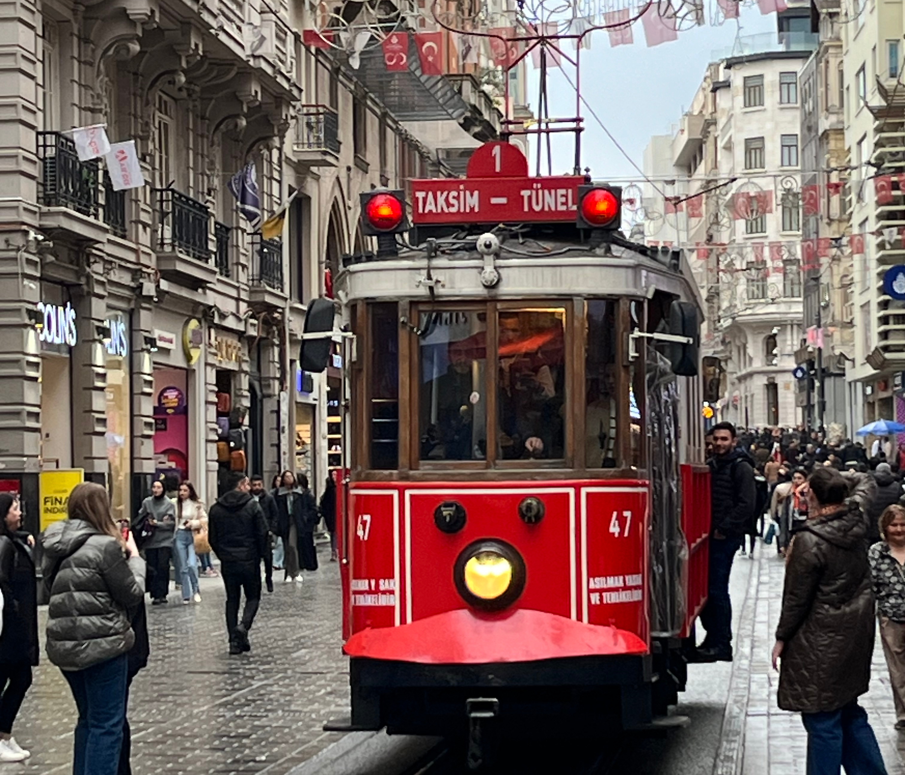 Die İstiklal Straße mit Straßenbahn zum Taksim-Platz und CHP-Wahlkampf-Wimpeln © Esther Slevogt