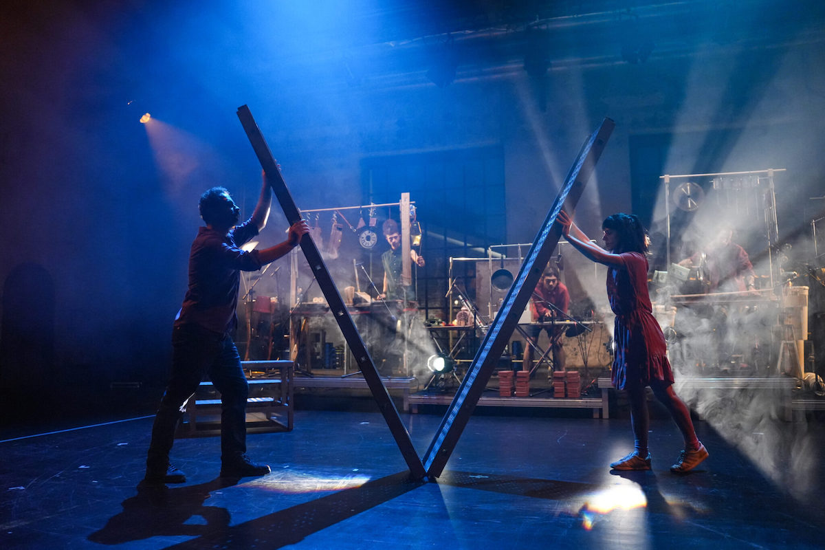 Unterlegt ist alles mit dem suggestiven Sound von Live-Percussionsmusik der Tophane Noise Band, die ihre Instrumente aus dem Müll der Metropole gebaut haben: aus alten Fahrrädern, Plastikflaschen, Rohren, Blechtonnen und anderem Gerümpel, mit dem sie nun einen dystopischen Sound produzieren.
