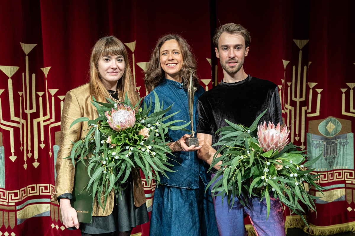 Preisträger*innen: Viktoria Feldhaus, Charlotte Müller (Max-Grünebaum-Preisträgerin 2023) und Torben Appel. © Bernd Schönberger