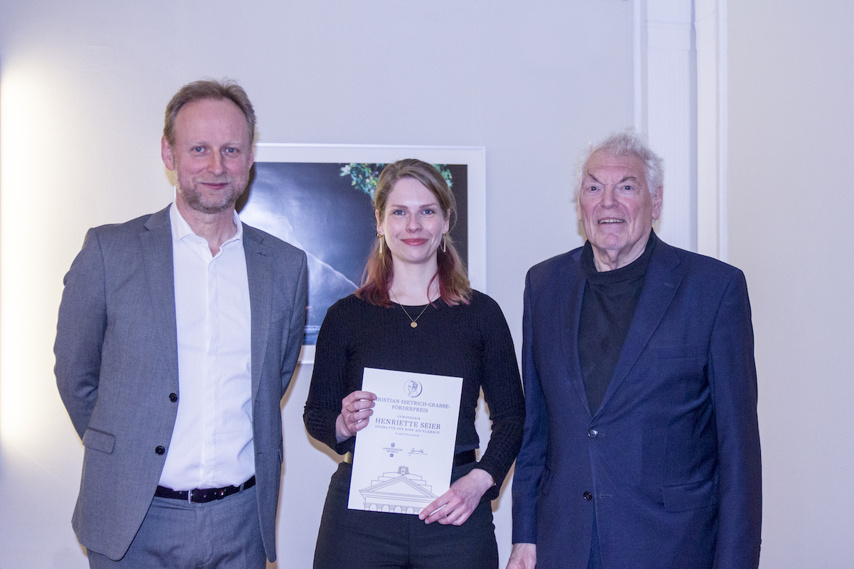 Henriette Seier, 1993 in Rostock geboren, erhält den Christian-Dietrich-Grabbe-Förderpreis für ihren ersten Theatertext, "Drama für den Kopf. Ein Klamauk", eine "mit viel Kenntnis und Witz verfasste Satire über Theater und Publikum", heißt es auf der Webseite des Grabbe-Preises. Ihr Text, in dem ein Regisseur als Opfer von Regieanweisungen wie eine Schnecke die Wände hochkriechen und sein Geschlecht wechseln muss, eine Schauspielerin von der in Persona auftretenden Stimmung abhängig ist und sich ein Chor in graue Mäuse und Mauerblümchen verwandle, schwinge "lässig hin und her zwischen Spiel und Ernst, Verhandlung und Unterhaltung, Beobachtung und Vision", so die Jury.