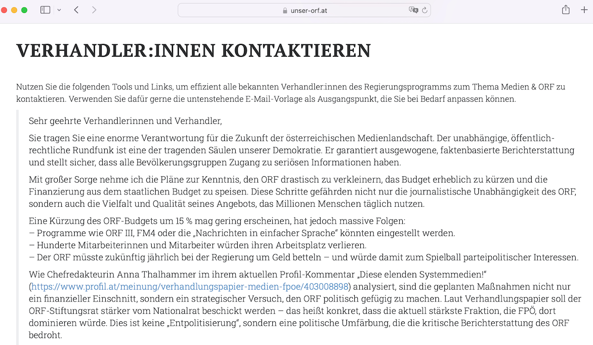 Die Verhandler*innen seien verantwortlich für "eine der tragenden Säulen unserer Demokratie", heißt es in dem Musterschreiben, das digital an zehn verschiedene ÖVP-Unterhändler*innen geschickt werden kann. Die von der FPÖ geplanten Maßnahmen, darunter Kürzungen von 15 Prozent im ORF-Budget, bedeuteten nicht nur einen finanziellen Einschnitt, sondern seien "ein strategischer Versuch, den ORF politisch gefügig zu machen". Laut Verhandlungspapier der möglichen Koalitionäre solle der ORF-Stiftungsrat stärker vom Nationalrat beschickt werden; "das heißt konkret, dass die aktuell stärkste Fraktion, die FPÖ, dort dominieren würde". Anders als immer verlautbart, bedeute das "keine 'Entpolitisierung', sondern eine politische Umfärbung, die die kritische Berichterstattung des ORF bedroht", so das Musterschreiben.