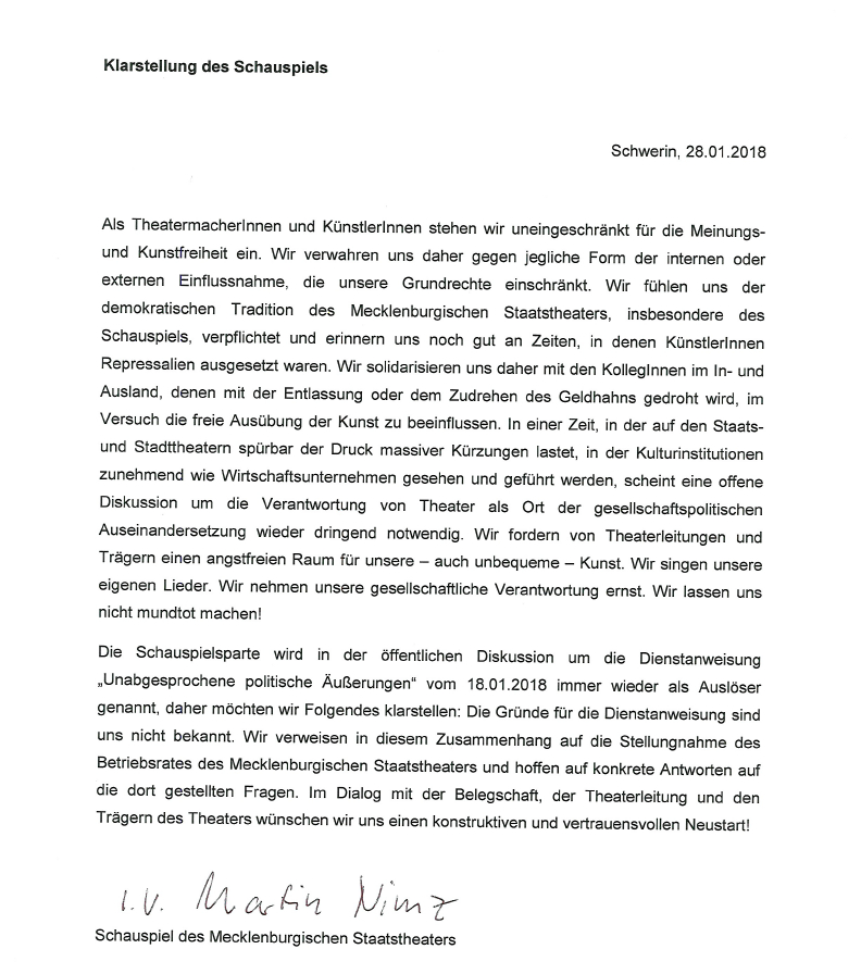 31. Januar 2018. Angesichts einer Dienstanweisung am Schweriner Theater, sich auf dem Theaterball nicht "unabgesprochen politisch" zu äußern, hat sich nun der Schweriner Schauspielchef Martin Nimz mit einer Klarstellung des Schauspiels zu Wort gemeldet. Darin heißt es, dass man die Gründe für die Dienstanweisung nicht kenne, "aber wir fühlen uns der demokratischen Tradition des Mecklenburgischen Staatstheaters, insbesondere des Schauspiels, verpflichtet und erinnern uns noch gut an Zeiten, in denen Künstlerinnen Repressalien ausgesetzt waren." Hier das vollständige Schreiben. Auch der Betriebsrat des Theater hat sich mittlerweile in einer Stellungnahme geäußert und den Generalintendanten zur weiteren Klärung der Sache aufgefordert,