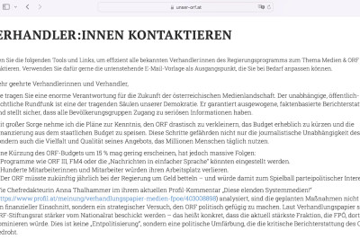 11. Februar 2025. Gegen die Pläne der österreichischen FPÖ, im Falle ihrer Regierungsbeteiligung dem öffentlich-rechtlichen Rundfunk ORF Gelder zu kürzen und die für alle Bürger*innen geltende Haushaltsabgabe zu streichen, hat sich im Januar 2025 eine zivilgesellschaftliche Plattform gegründet. Mit einer Petition tritt sie für den Erhalt der öffentlich-rechtlichen Medien ein. Aktuell fordert unser-orf.at, das von namhaften Organisationen und Künstler*innen unterstützt wird, dazu auf, die ÖVP-Vertreter*innen in den Koalitionsverhandlungen per Mail an die Bedeutung einer von parteipolitischen Einflüssen freien journalistischen Berichterstattung zu erinnern.